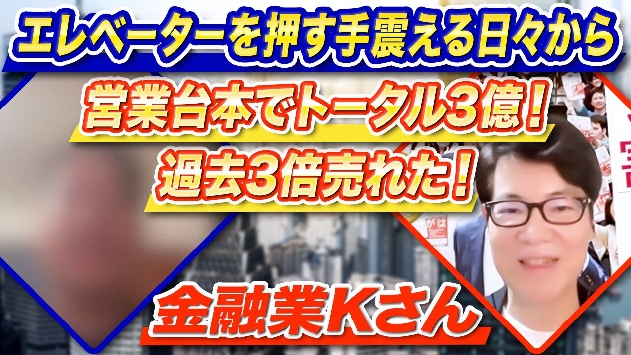 エレベータ押す手が震える日々から、トータル3億、3倍売れた!〜金融業Kさん〜金融業で10年のキャリアを持つKさん。営業所40名中39位···